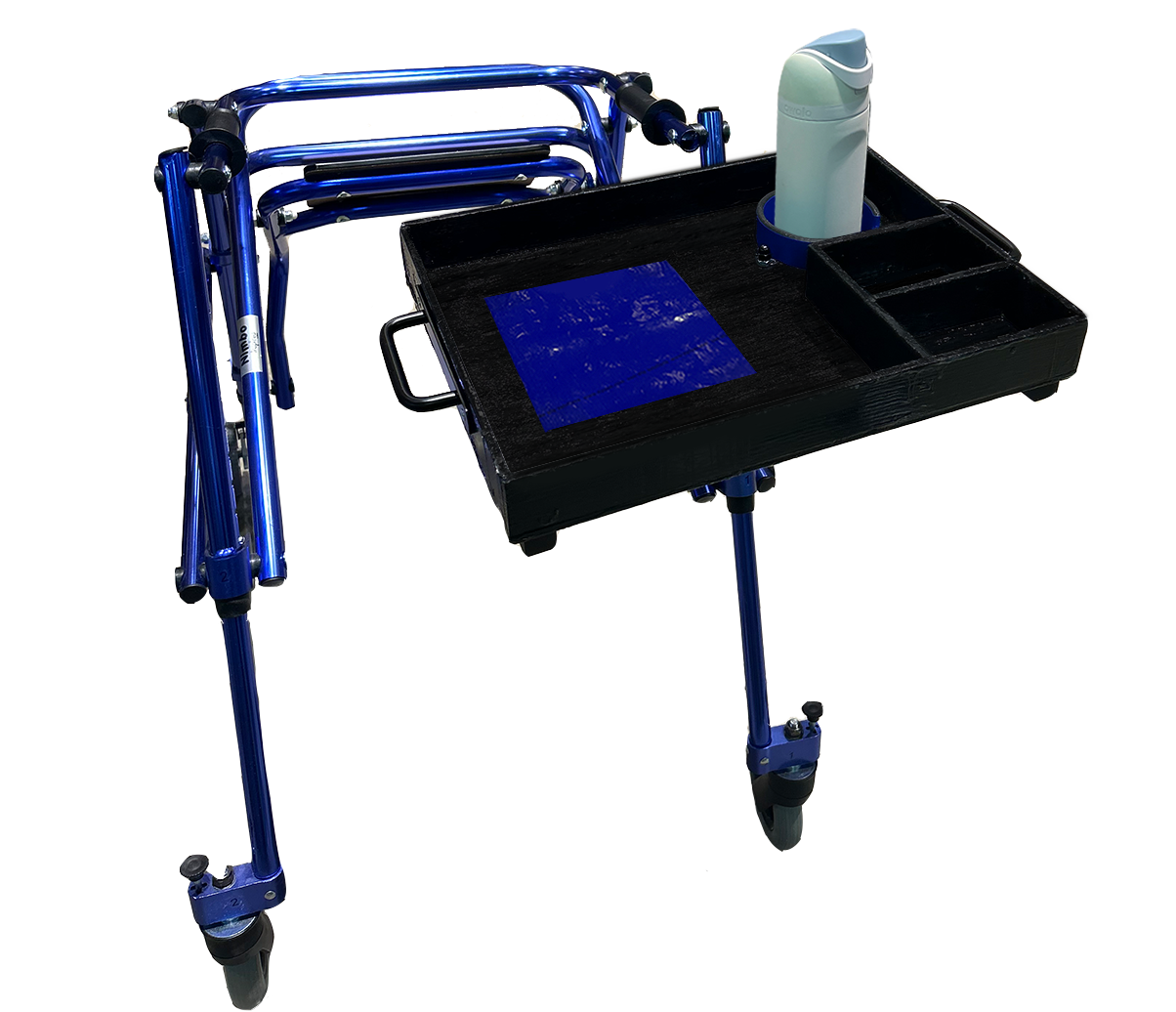 A walker-mounted tray and cup holder that allows reverse walker users to carry items while moving